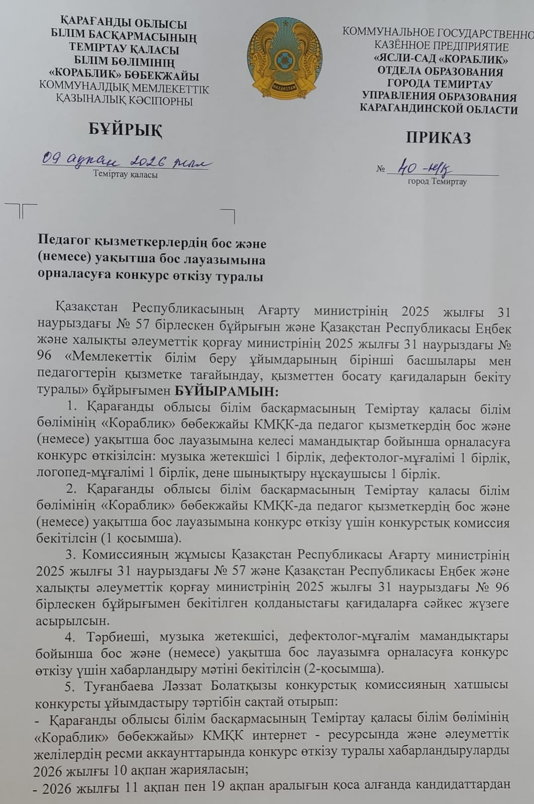 Педагог қызметкерлердің бос және (немесе) уақытша бос лауазымына орналасуға конкурс өткізу туралы