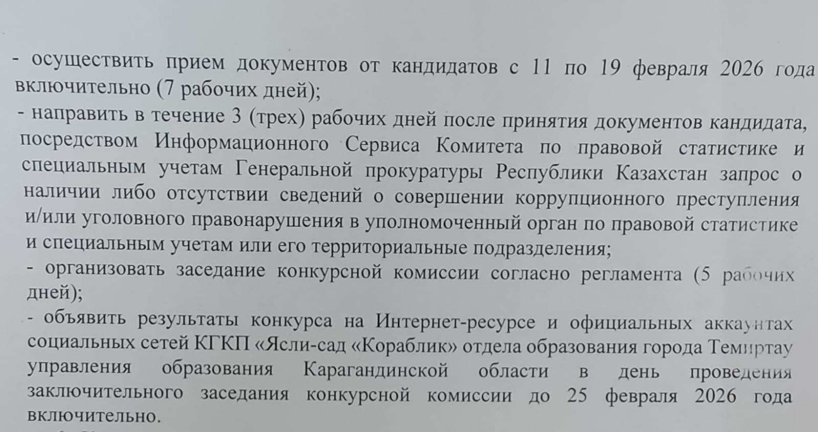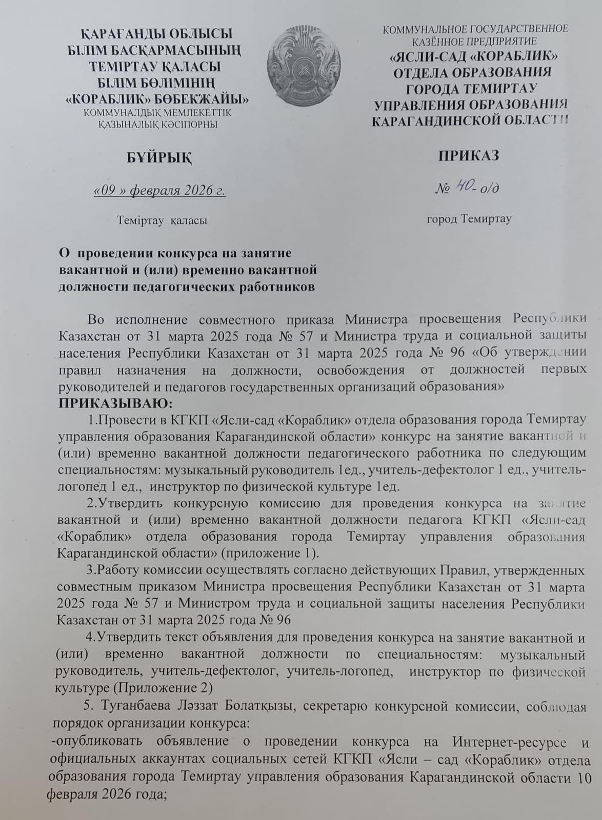 О проведении конкурса на занятие вакантных и (или) временно вакантных должностей педагогических работников